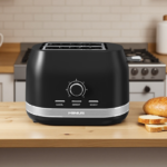 Minus 2-slice toaster with crumb tray, automatic pop-up and cord storage.