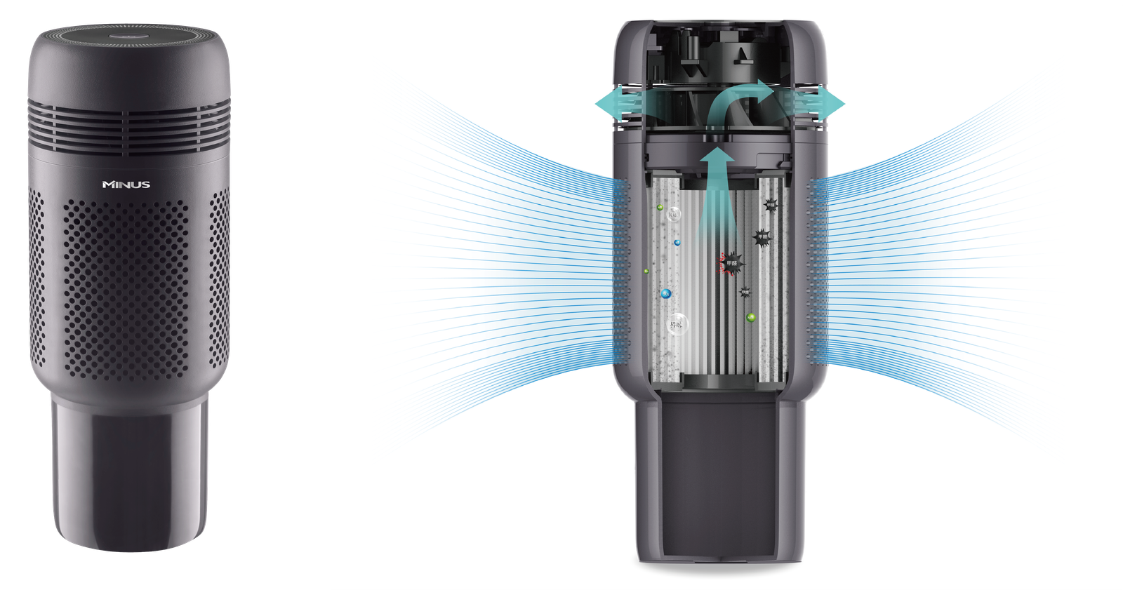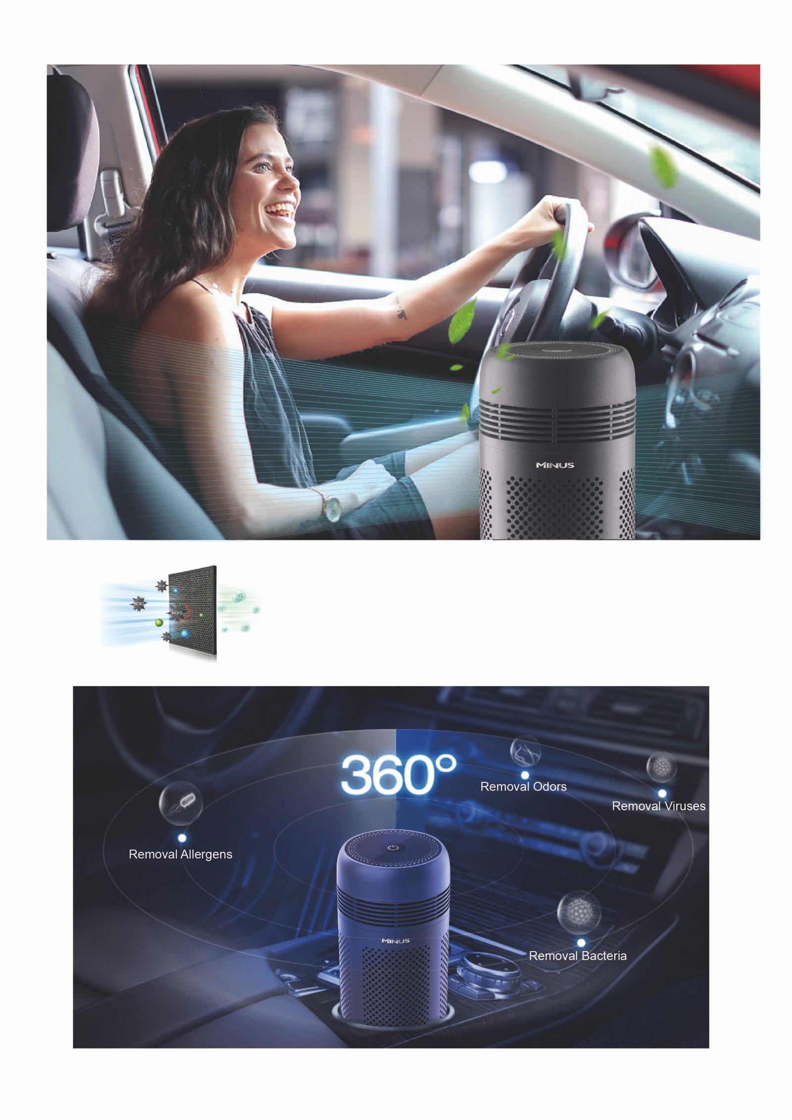 Car purifier adopts innovative formaldehyde decomposition technology, CADR fomaldehyde can reach 15m³/h, removal formaldehyde fast and more effective, no secondary pollution, Efficient removal of formaldehyde, toluene. odor and other pollutants in the car.